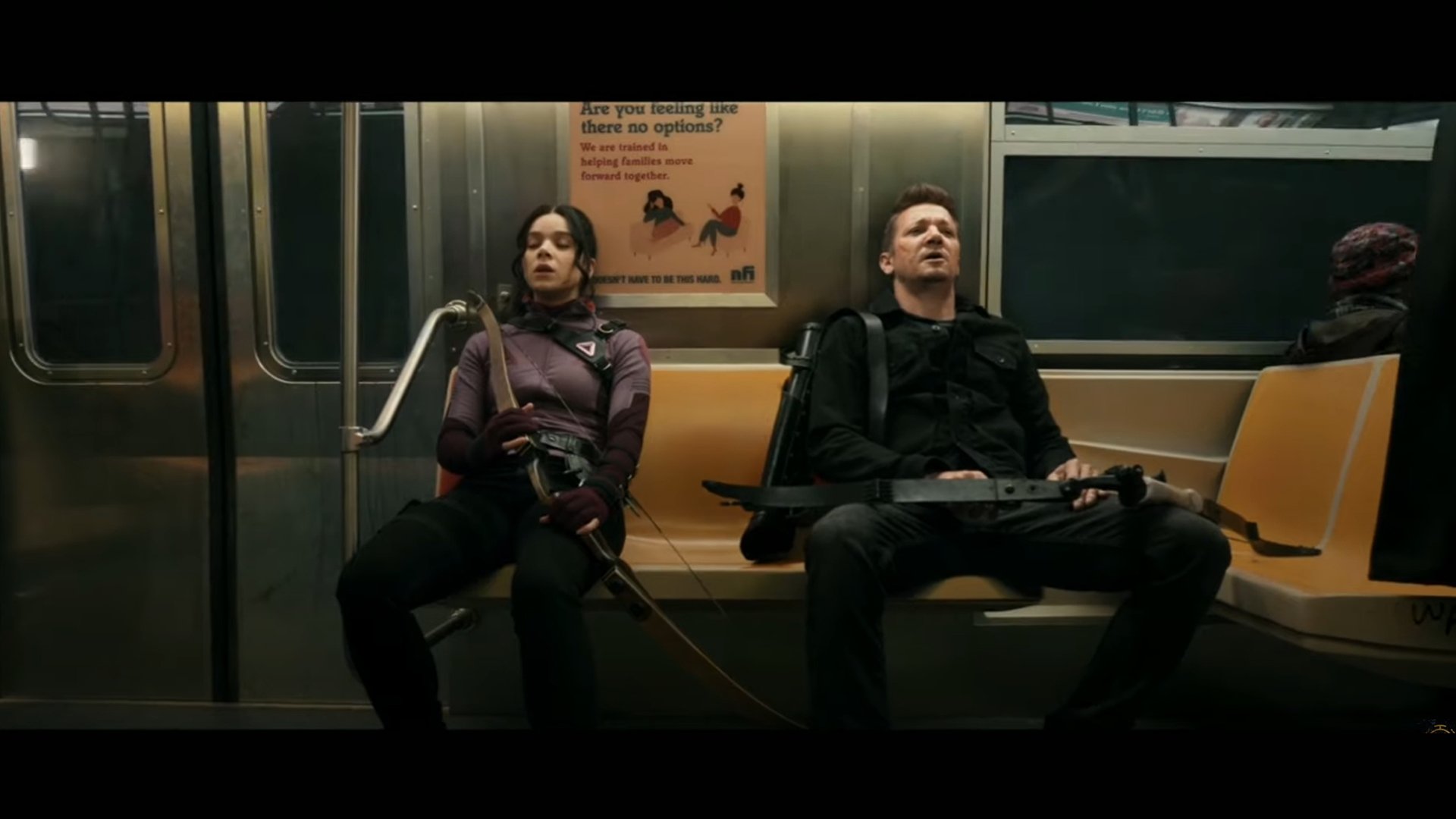 A scene from the Hawkeye tv show redrawn paying homage to the Matt Fraction / David Aja comic that inspired it.